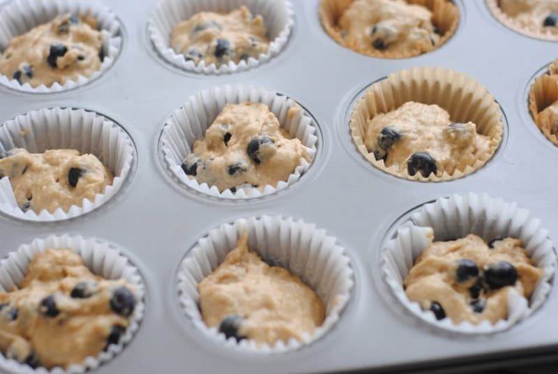 Scoop the blueberry muffin batter into the muffin wells, filling each about 1/2 way.