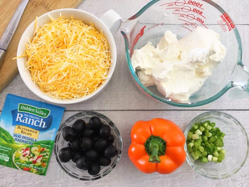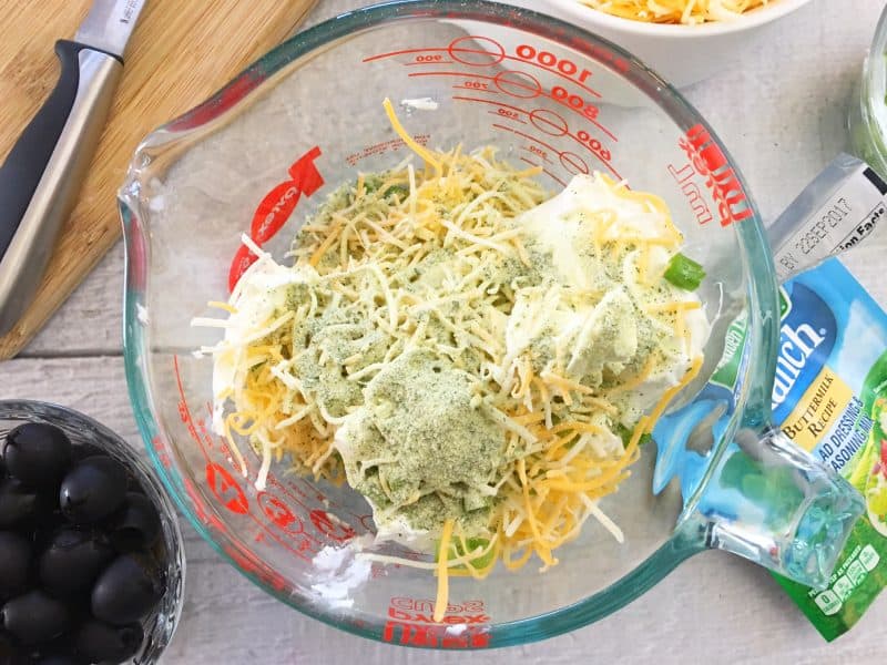1. In a large mixing bowl, combine your cream cheese, 1/4 cups shredded cheese, green onions, and ranch seasoning and mix using a hand or stand mixer until combined.