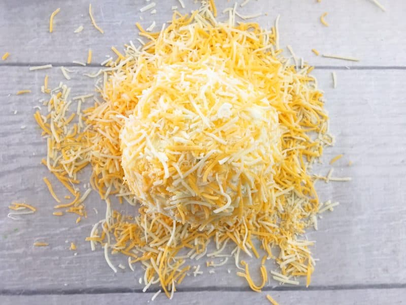 3. Unwrap your cheeseball, coat with your shredded cheese, and place onto the center of your serving plate.