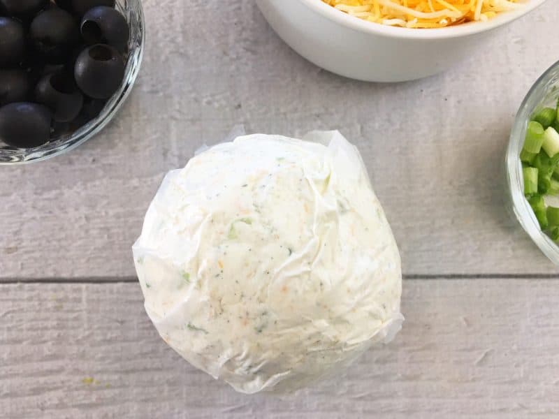 2. Form your cream cheese mixture into a ball, wrap in wax paper and place in the fridge for an hour to chill.