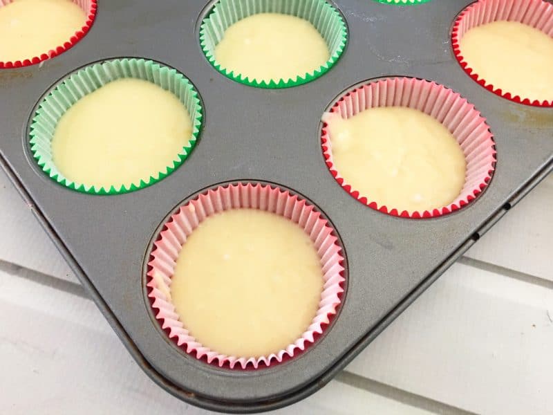Fill your cupcake liners halfway with your cupcake batter, bake for 15 minutes and let cool.