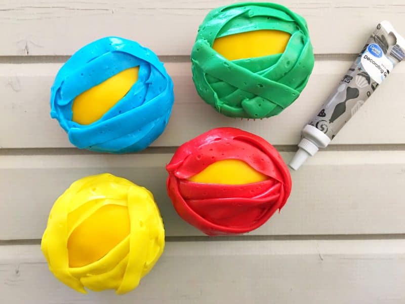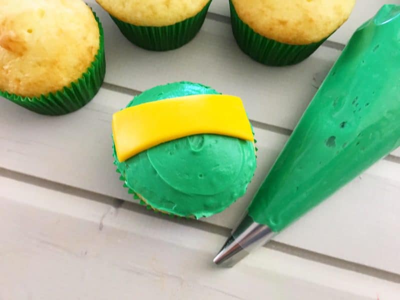 Fill your decorating bag with your matching frosting to your cupcakes (you will have to switch the tip to a new bag for each color) and frost each cupcake by drawing flat lines across your cupcakes (think mummy) leaving an opening on the yellow fondant for the eyes.