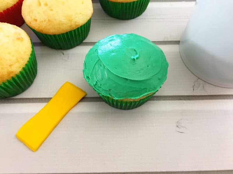 Lightly frost six cupcakes with your green frosting, six with your blue frosting, six with your red frosting and six with your yellow frosting.
