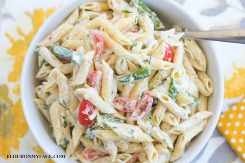 Fresh Asparagus Tomato Pasta Salad from Flour on My Face