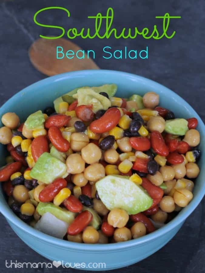 Beans are always great for parties- they are full of protein, good for you, and they are both gluten free and vegetarian, so everyone can enjoy them. Our three Southwestern Bean Salad bowl always comes back empty from parties.