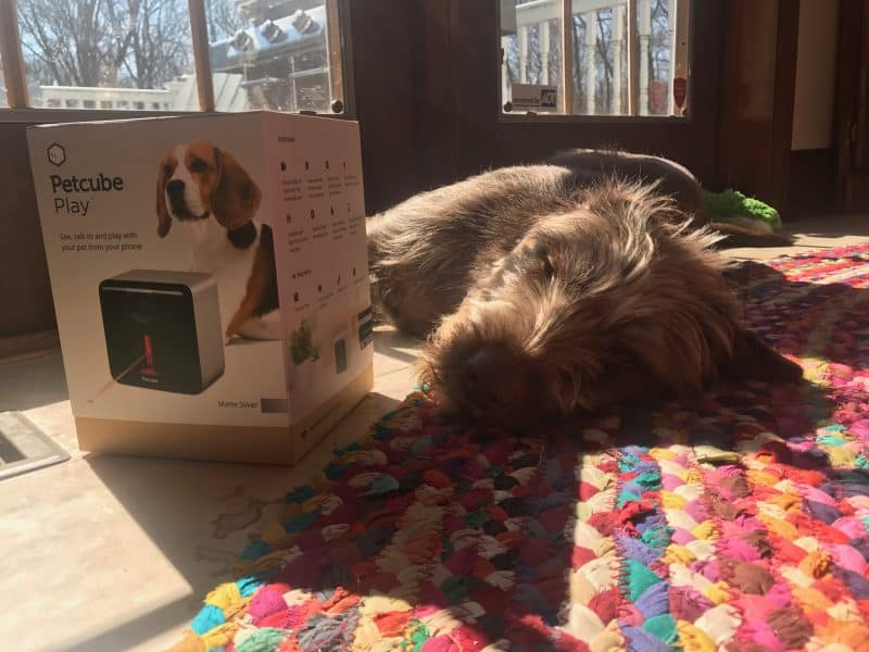 The playing thing is fun, and Brownie does like to chase the laser- we tried to get the cat to do it but apparently, she’s just can’t even deal with us lately, so she won’t even turn her head (what cat turns down a laser dot?)! But Brownie will engage and play around. Mostly, though, I love that I can kind of check in and she can hear my voice, and feel reassured that I’m not far away. When I get home? She’s pooped. Ready for a nap.