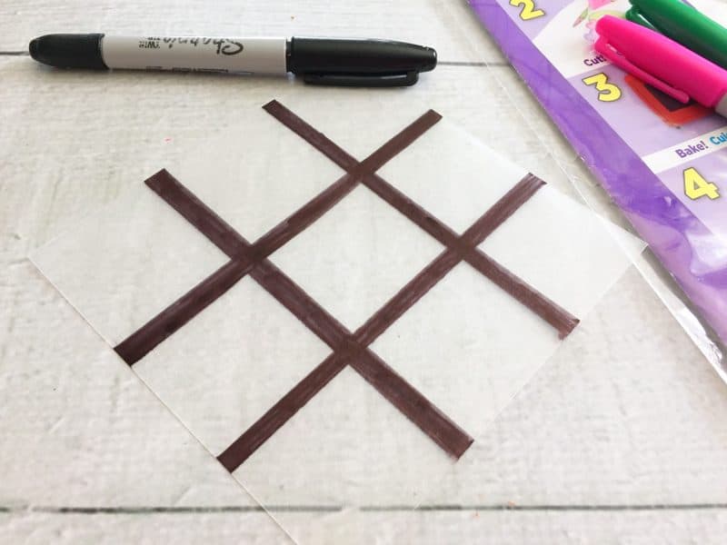 1. Cut out a 5×5″ square from your shrinky dink paper and draw a tic tac toe board onto the front with your black permanent marker.
