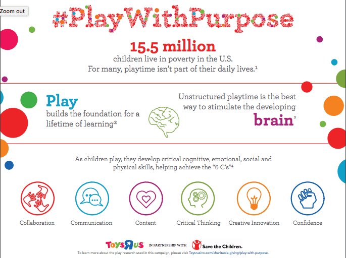Toys“R”Us has partnered with Save the Children (a nonprofit committed to ensuring all U.S. children have a healthy start) in a fundraising and awareness campaign to provide kids in impoverished regions of the country with opportunities and resources to integrate purposeful play into their everyday lives; a factor proven critical in children’s emotional, physical and cognitive development and future growth.