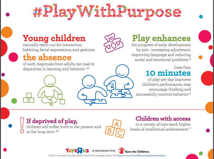The #PlayWithPurpose campaign is designed to support Save the Children’s early childhood development programs which help children in some of America’s most underserved communities thrive. To further assist families, Toys“R”Us will provide Save the Children with “play packs” filled with toys that build key skills and encourage socialization, along with informational materials to educate parents on the benefits of engaging with their children during play.