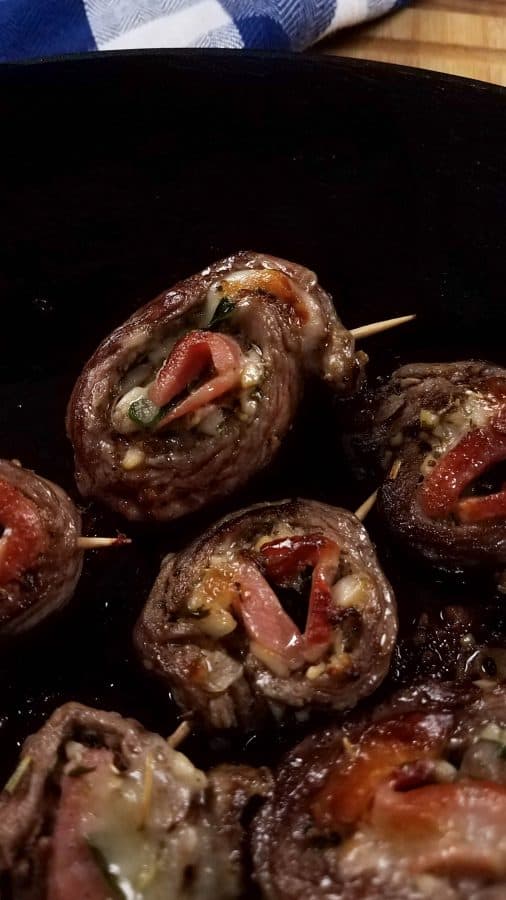 Carefully slice the steak into pinwheels between each toothpick.