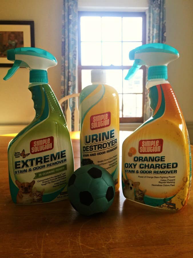 Simple Solution Disinfectant Stain & Odor Remover disinfects as it cleans and kills 99.9% of germs: Escherichia Coli, Salmonella enterica, Staphylococcus aureus, and A H1N1 virus. We use this all the time. Not just for Brownie, but for the house.