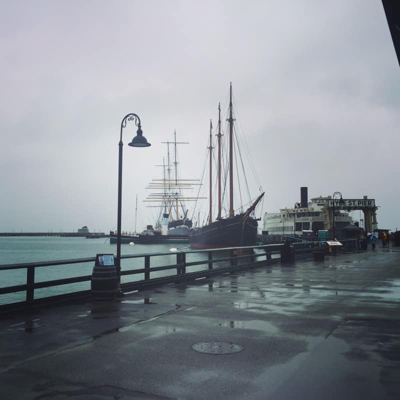 We rode the cable car down to the waterfront headed to a Starbucks to have a quick bite out of the rain. (PS when people say pack an umbrella and raincoat when you go to SF, do it). Next, we explored the San Francisco Maritime National Historic Park for a bit, found shops to purchase an umbrella, coat and poncho for the 3 of 5 bloggers who didn’t listen to the “bring an umbrella or raincoat” suggestion, and decided we should Uber up to see the “Full House” house.