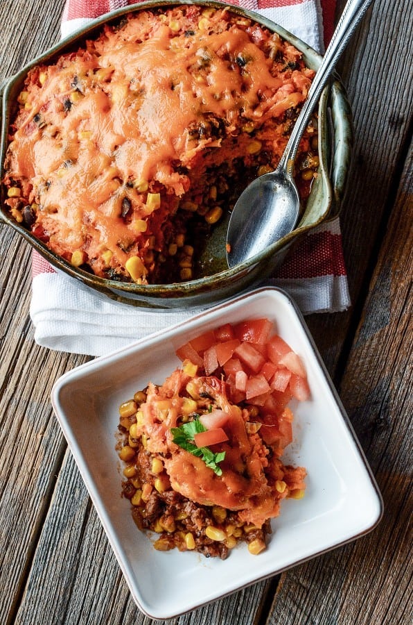 We are in the thick of winter here. I’m loving so much of winter but am also kind of feeling like I need more dinner ideas. My family absolutely loves Shepherd’s Pie, and they request it once a week if not more often. But to be honest… I get tired of making it the same way every time. That’s why, when my friend Joanne was telling me about this Southwestern Shepherd’s Pie she’d made with leftovers from our Sweet Potato Burrito recipe, I knew she had hit the jackpot. The same awesome dinner BUT DIFFERENT and exciting. Or, at least, sort of exciting.