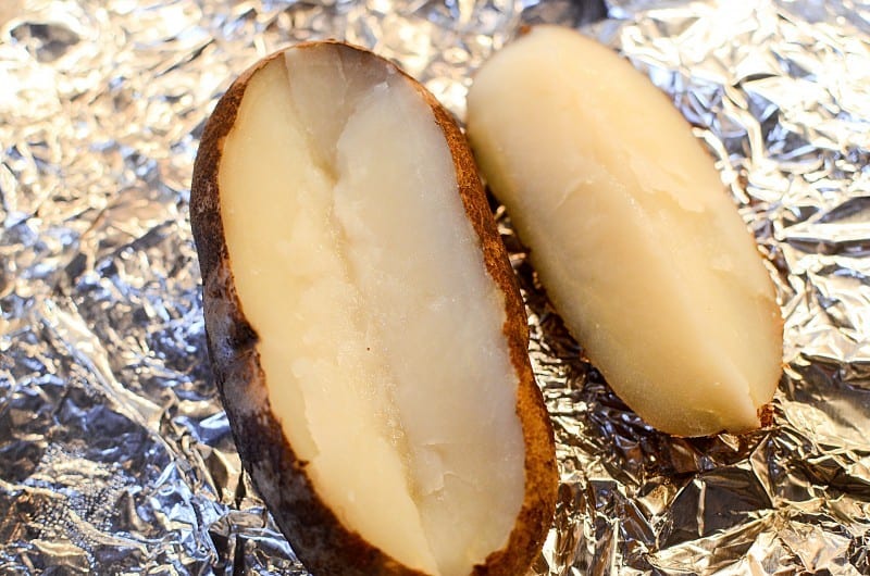Wrap washed potatoes in foil after you have taken a fork and pricked the potato all over the top. Bake for 40 – 45 minutes until a fork can be inserted easily. Let cool a few minutes so you can handle it with ease.