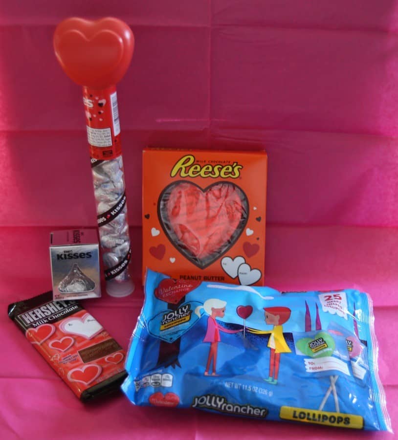 As luck would have it (for her), I do not own a basket that looks anything at all like it could work for Valentine’s Day so being sneaky, I asked her to borrow one… and then “Hugged” her with it. It was a whole lot of fun filling a basket with all kinds of goodies from Hershey’s-Hershey’s Milk Chocolate Hearts filled with Caramel, Reese’s Peanut Butter 5 oz. Heart, Hershey‘s 5 oz. Heart, some Kit Kat Valentine minis, and a Valentine box of assorted Hershey miniatures. I did also sneak a package of puppy treats in for their dog as well (tucked in back of basket).