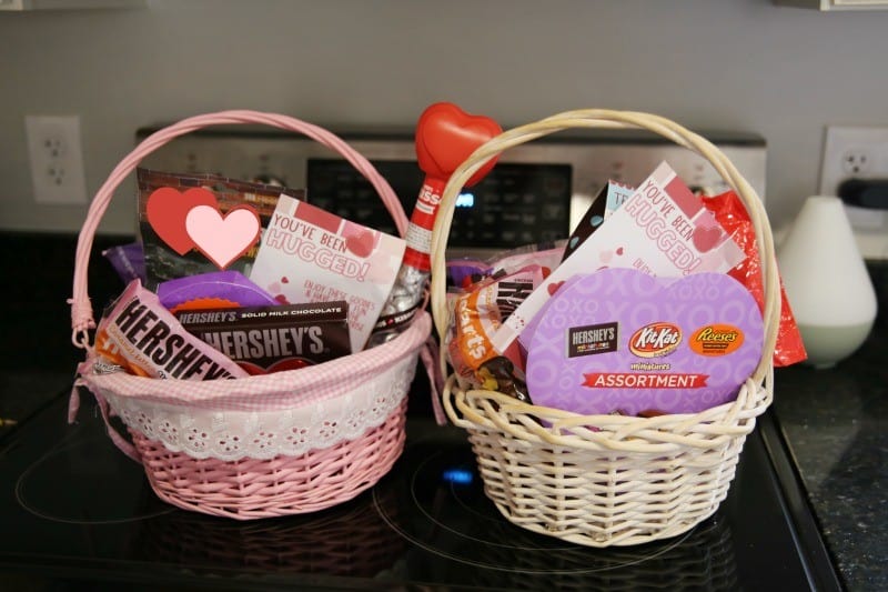 Valentine’s Day is coming and with it, all of the yummy Valentine’s Day candies and treats and chocolates. Hershey makes a whole bunch of my favorite candies, and sent us a lot of them last week with the task of doing something creative with them… like making a Valentine’s Basket for kids (I didn’t end up doing this, but my friend Angela did, so if you want to make one, you can find her post here). I was actually going to do a cute basket for the kids, but we’ve really been talking a lot about helping others and doing for others lately and I felt like I wanted to do something more in those lines. Hershey wants to start the tradition of creating Valentine’s Day baskets for your loved ones….and we like to make traditions for holidays with the kids… so we decided to make this Valentine’s Day even sweeter for the littlest loved ones with a “You’ve Been Hugged” Valentine’s Day Basket surprise…for the whole family!
